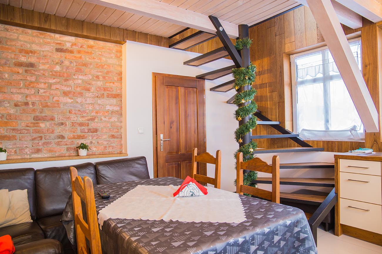 Poza Willą oferujemy również niezależny, drewniany domek z wyjątkowym klimatem, który posiada dwie sypialniami, salon z kuchnią i łazienkę - przeznaczony dla 4 osób. Dookoła znajduje się teren zielony, gdzie jest możliwość rozpalenia ogniska, grilla, leżakowania, czy zabaw na placu zabaw. Sąsiadujemy z lasem, więc widok sarny lub lisa na podwórku nie jest zaskoczeniem.